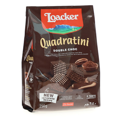 Quadratini Double Choc 250g, Quadratini Dark Chocolate 250g, Quadratini Cappuccino 220g, Qaudratini Tiramisù 220g, Quadratini Napolitaner 250g, Quadratini Chocolate 250g, Quadratini Vanilla 250g, Quadratini Lemon 250g, Quadratini Coconut 250g, Quadratini Espresso 220g,Quadratini Lampone Yogurt 220g, Quadratini Mirtillo nero Yogurt 220g, Quadratini Cocoa & Milk 250g, Quadratini Cannella 250g, Quadratini Pan di Zenzero 250g, Quadratini Peanut Butter 250g, Quadratini Meno zuccheri -30% Napolitaner 220g, Quadratini Meno zuccheri -30% Chocolate 220g, Quadratini Matcha 220g.